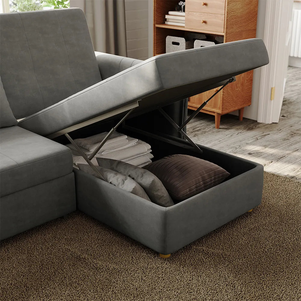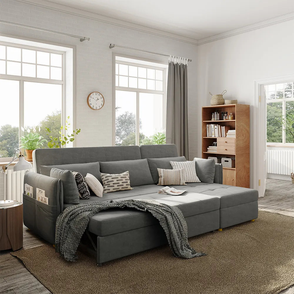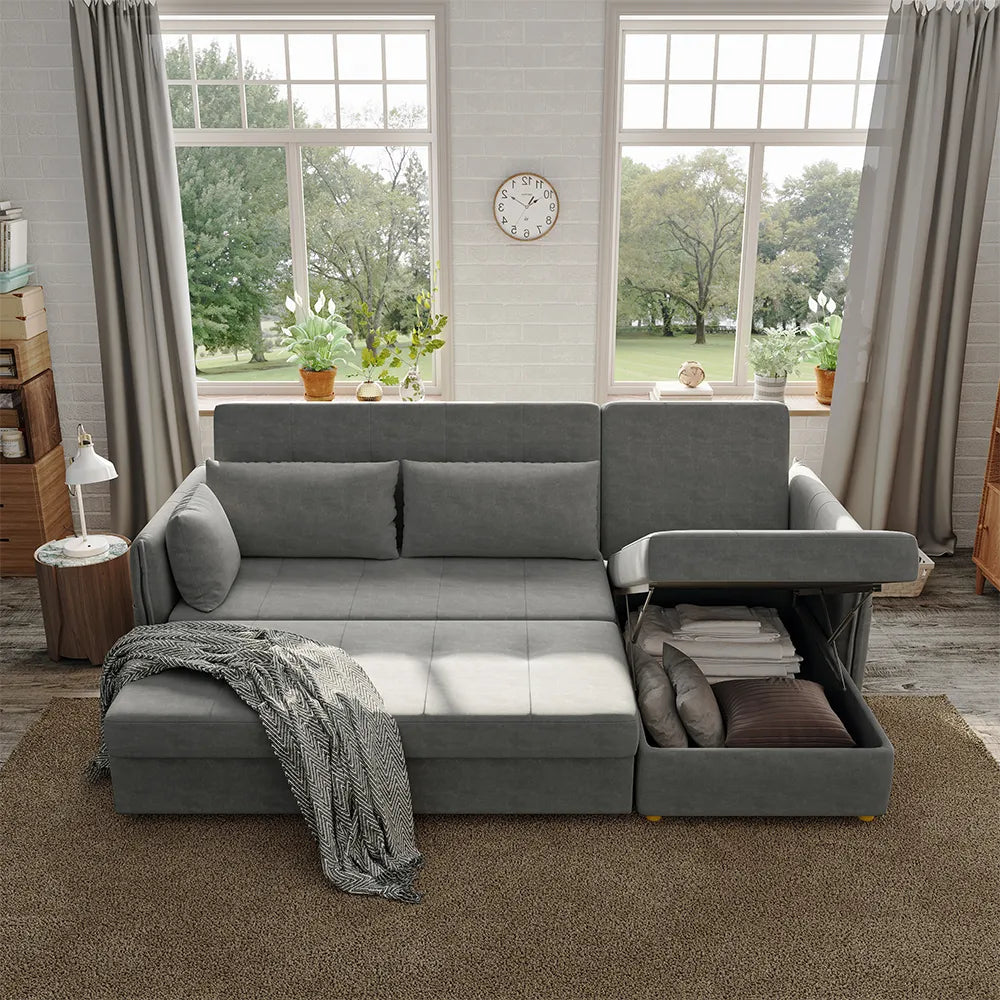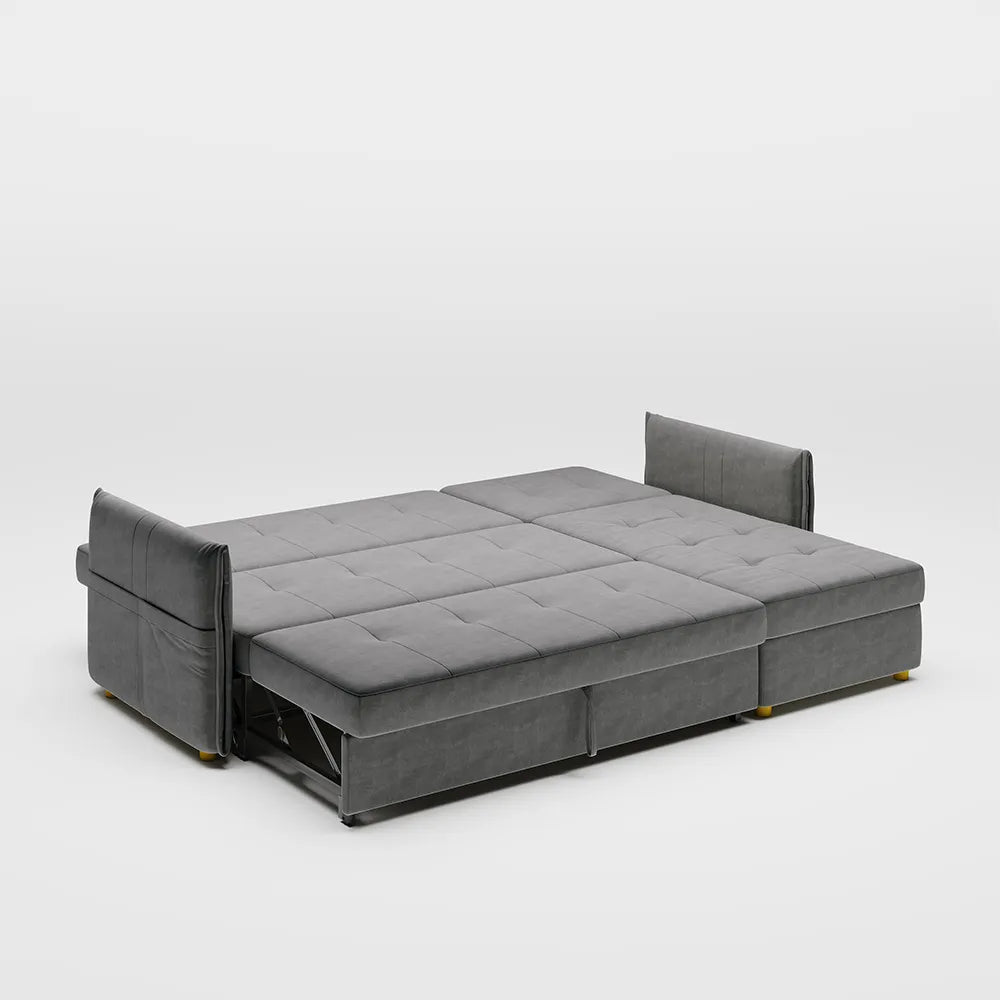 Sofa cum bed with multi functionality like pullout+ storage + Fold out in a chic grey color is the perfect space-saving solution for your home. This versatile piece easily converts from a comfortable sofa to a convenient bed, offering flexibility for guests or lounging. Crafted with style and functionality in mind, its modern design and neutral color seamlessly blend into any decor. Elevate your living space with the Mabel Fold Out Sofa cum Bed, where comfort and practicality meet sophistication.