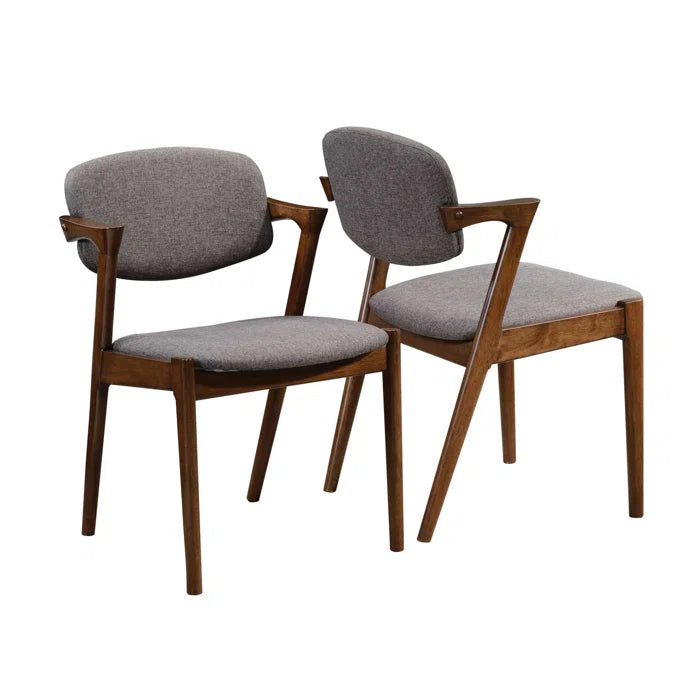 This handsome seven-piece dining set is sure to meet every expectation for a stylish and functional dining space. This transitional style dining set boasts modern elements, coming complete with a two-tone wood dining table. The dark walnut finish on the U-frame base of the table beautifully blends with the walnut veneer tabletop. Six Parson chairs come with the set, contouring to your back to give an exceptionally comfortable dining experience. Each dining chair is armless in design and upholstered in a grey fabric.