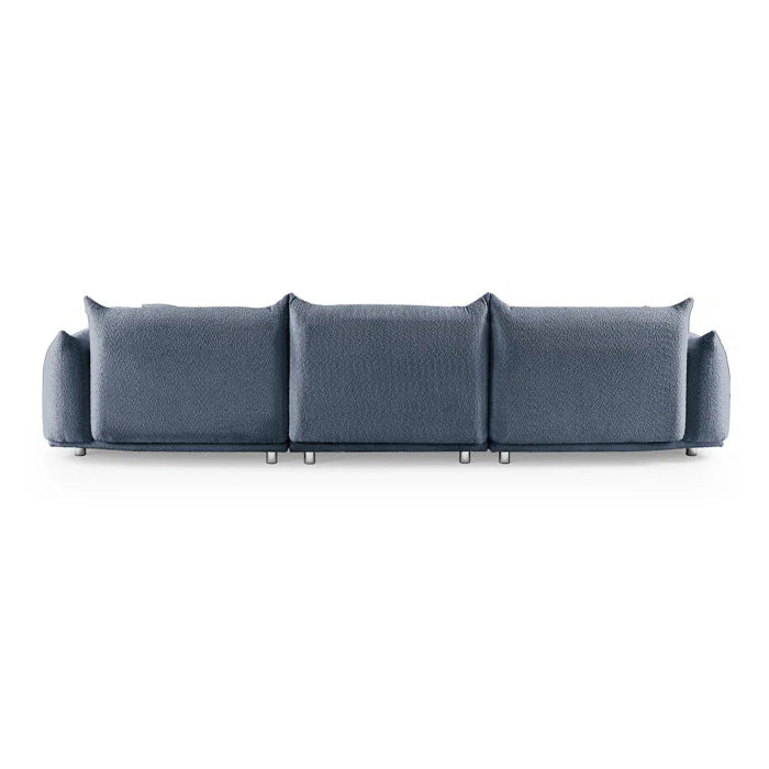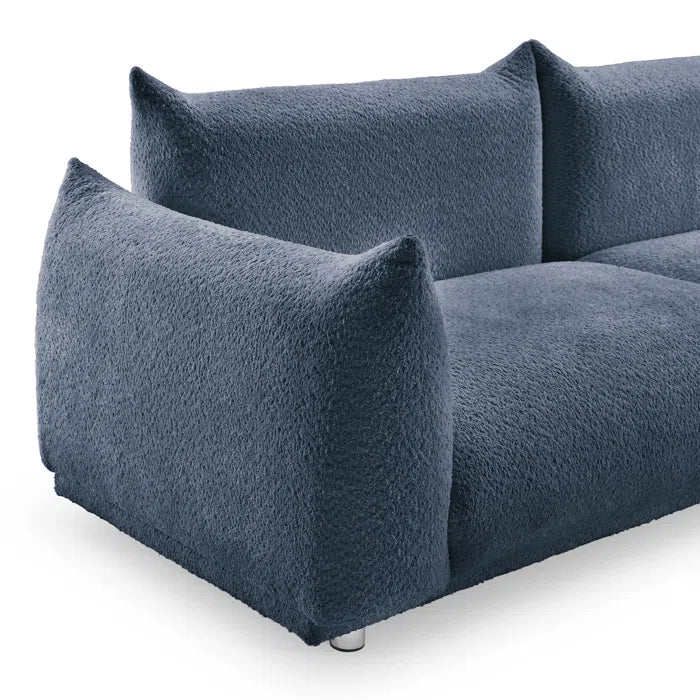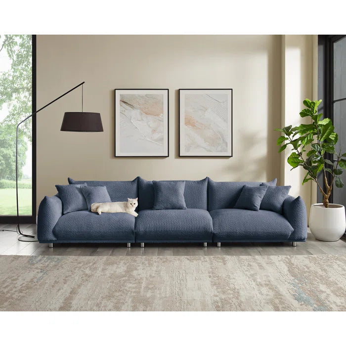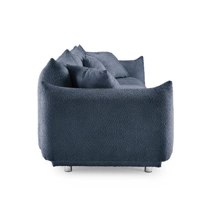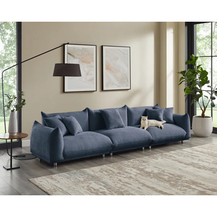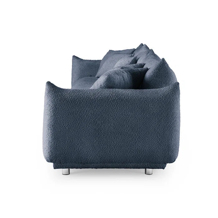 This modern sofa is here dressed in a very strong and fashioned Boucle feel fabric. Smooth touching and feeling when you are sitting on it. Big-size seat cushions are built with high-quality inner pocket springs surrounded by high-density foam and a solid wood frame for the absolute best seating comfort. Pay attention to the chrome metal legs that fit the nice modern design! Including 5 pillows just for free.Â