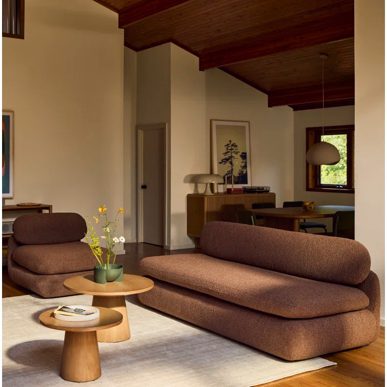 Inspired by the captivating styles of the ‘70s, this sofa brings a piece of the past into the present. Clad in textured boucle fabric, it merges visual allure + tactility. A curved form, combined with a rounded and elongated cushion, introduces a touch of softness to any space, while the plump seat cushion promises modern comfort.