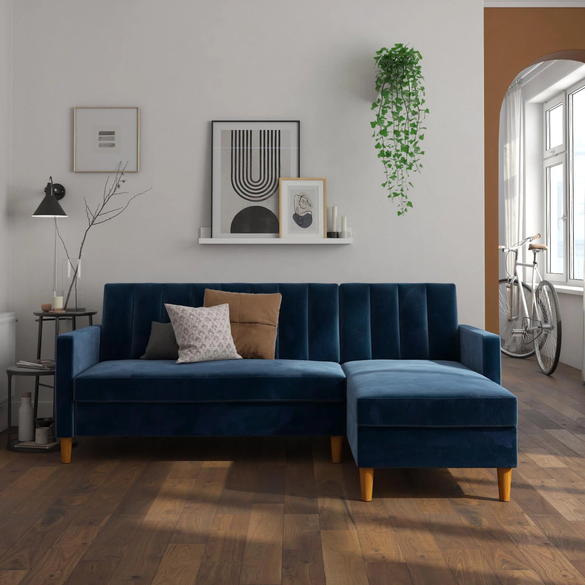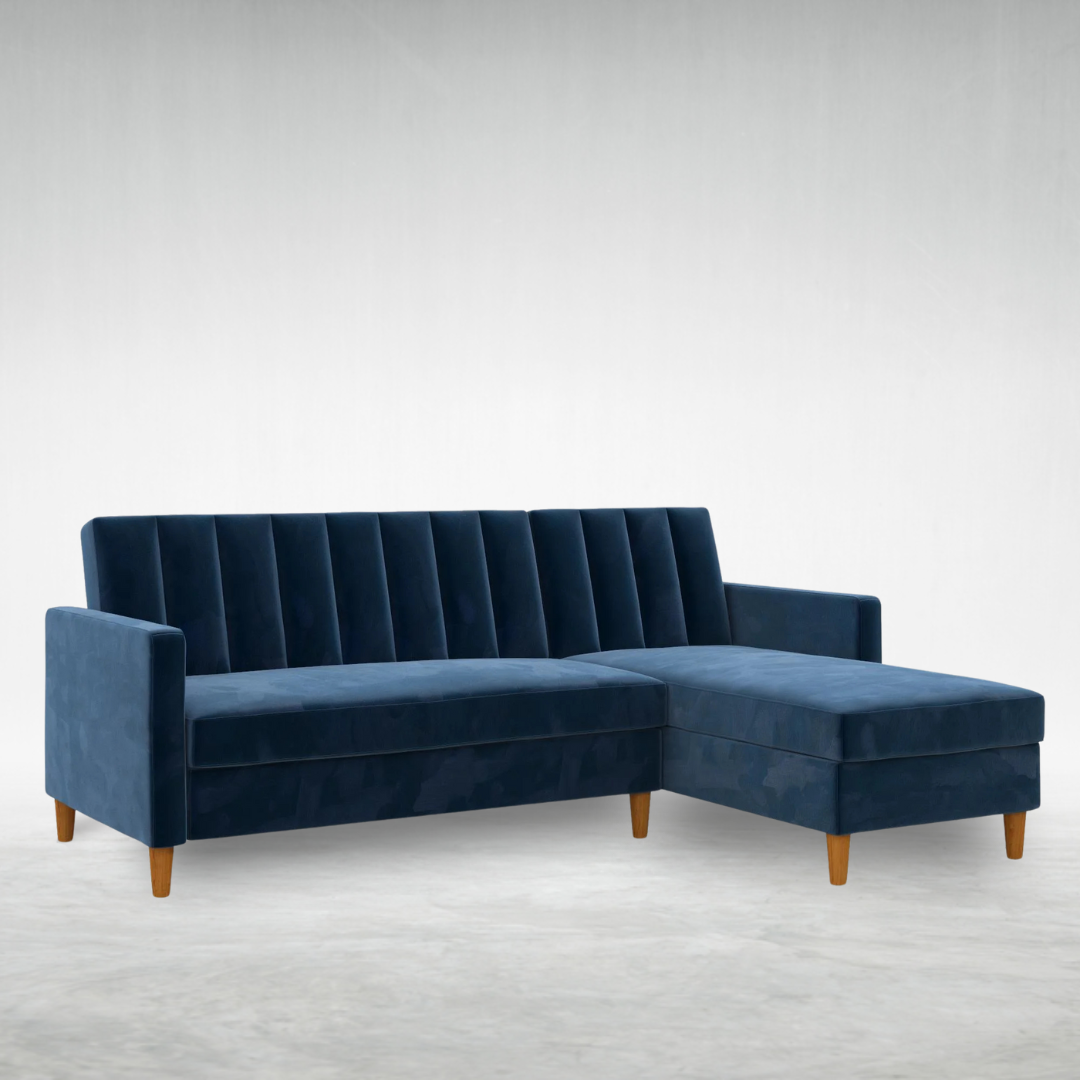 Modern convertible sectional sofa bed with velvet upholstery and vertical stitching in the backrest.