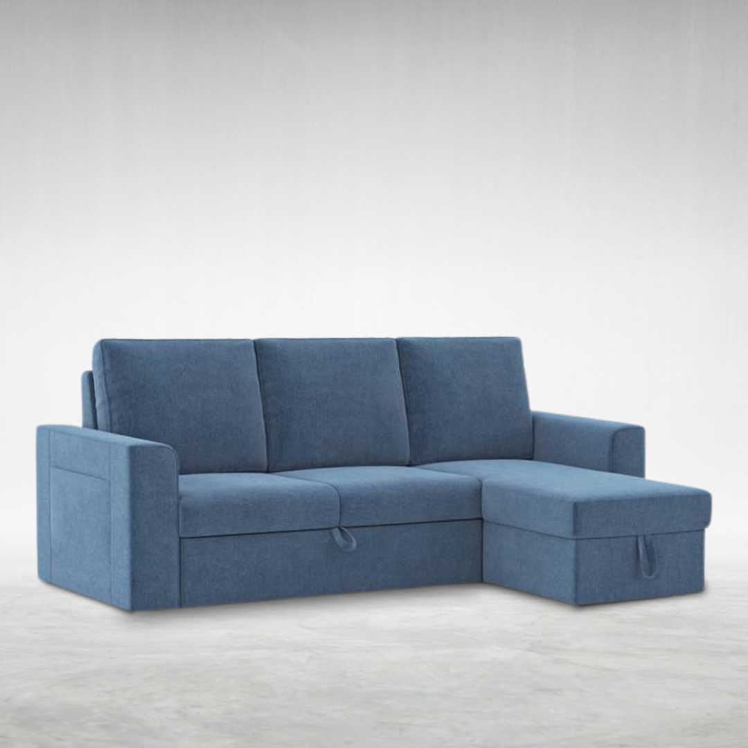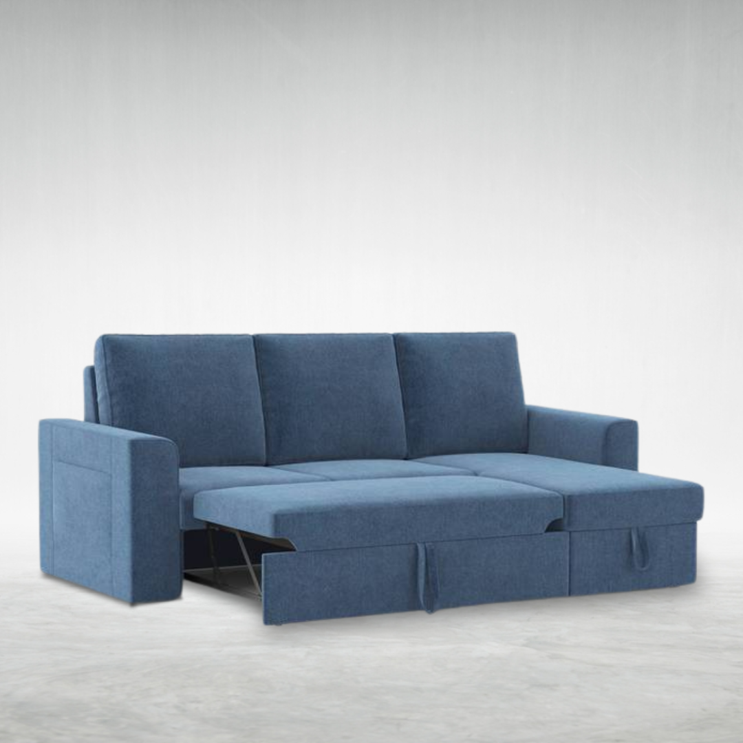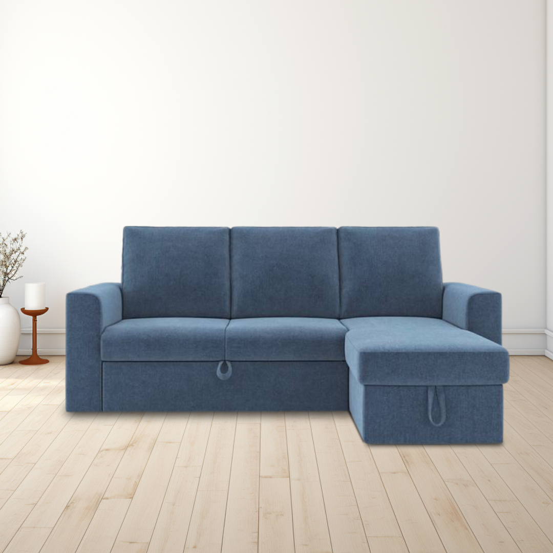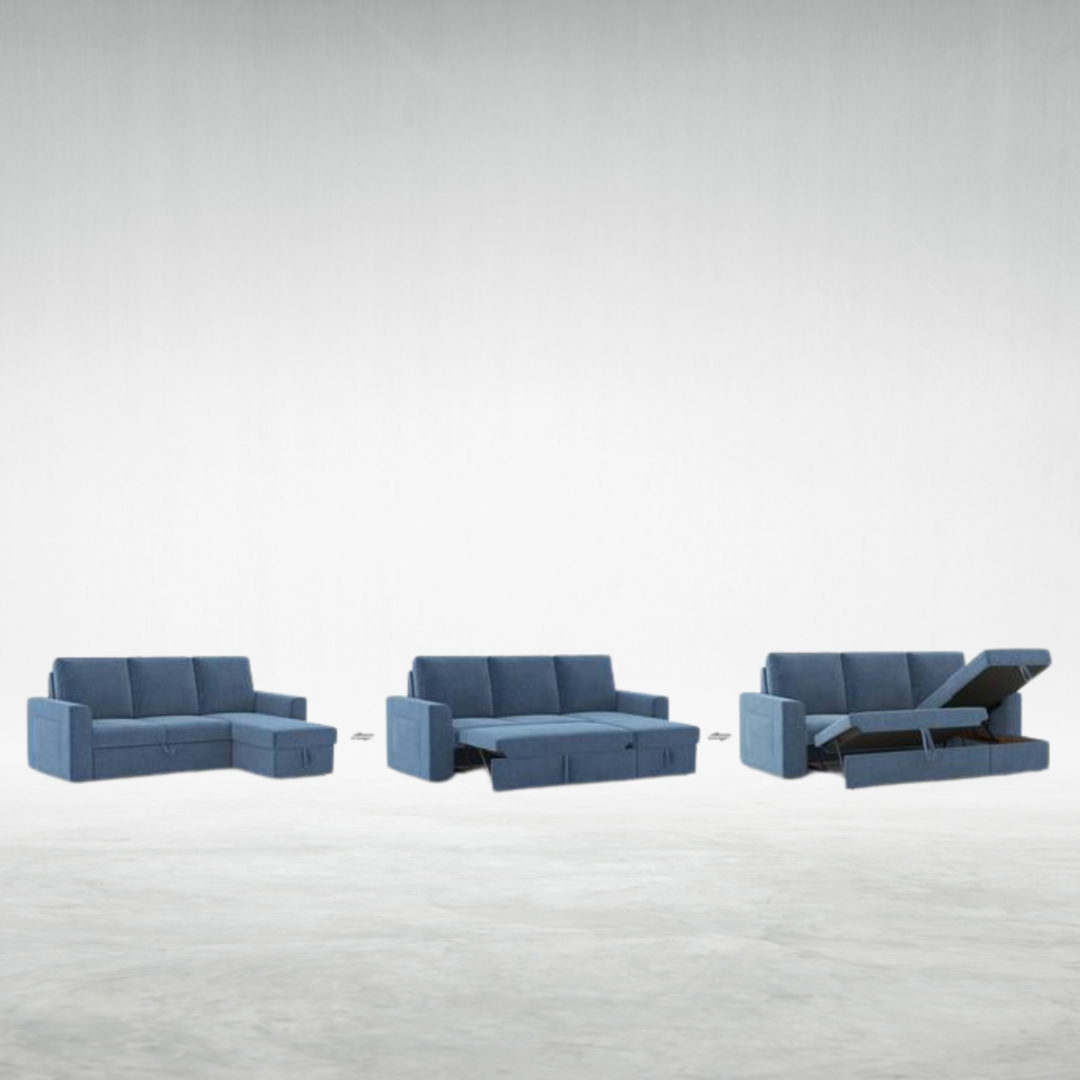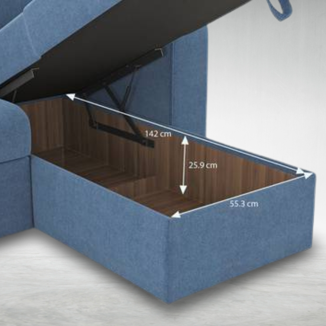 Sapphire helps you make the most of your space by hiding a guest room in the middle of your living room. Its perfect match for small living room. By day, it's a comfortable sectional sofa that seats four. But simply roll out the drawer and pull the extra bed section out and up, to transform it into a spacious double bed in seconds. Lift the chaise to tuck away pillows, blankets, and more in the spacious storage area below.